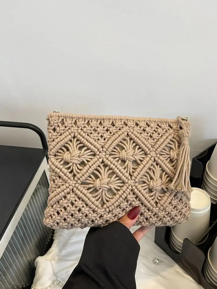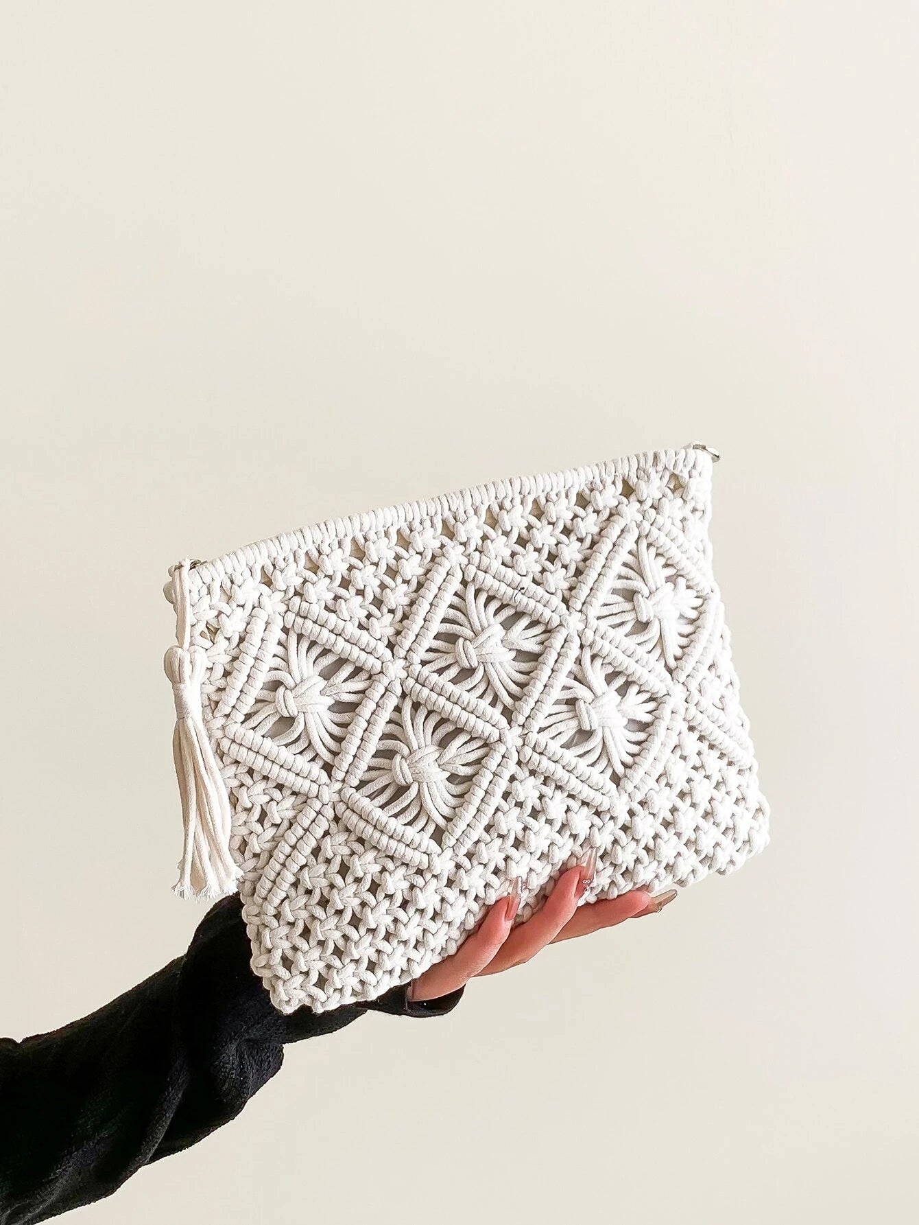 Клъч плетен в бежово, черно и бяло Размери 28/20 см Материал 100% Polyester *моделът в бежово е със статус Очаквана наличност