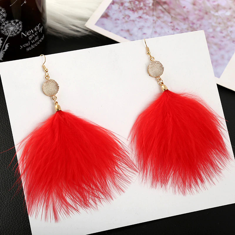 Обеци с пера в черно, червено и зелено Дължина 14 см Материал метал и пера